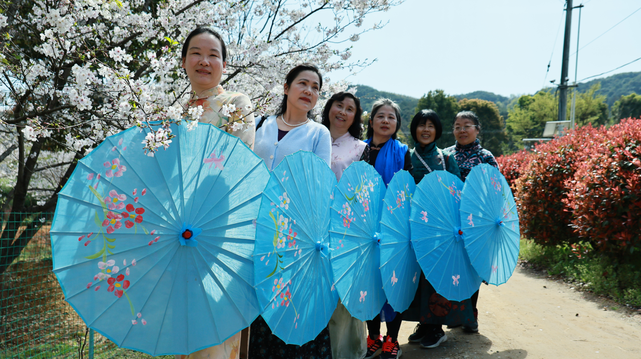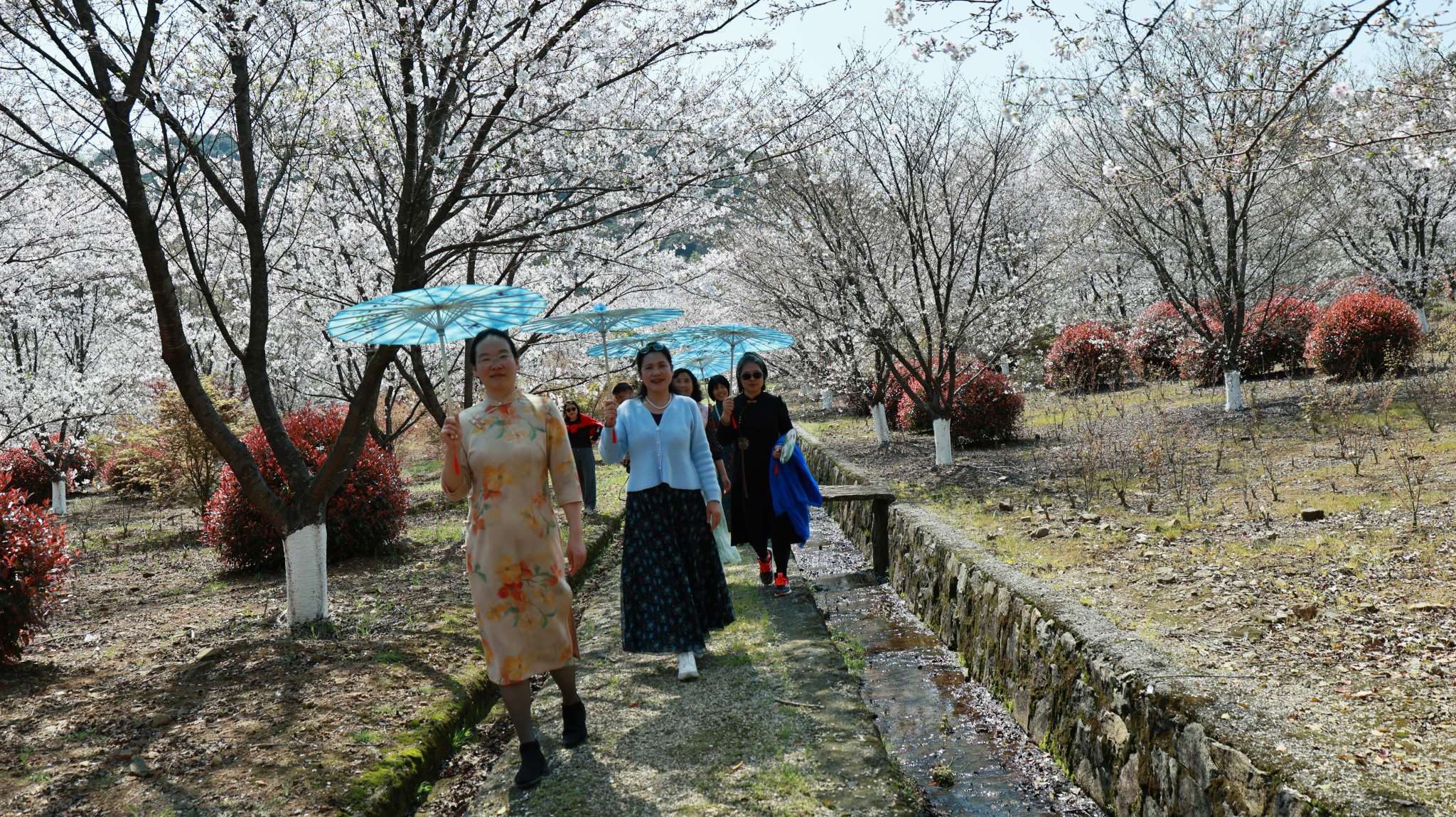 剑灶村的樱花林种植有3000余株樱花,主要品质为染井吉野、关山樱,是绍兴地区春季赏樱首选地。初入樱谷,恍若置身仙境。数千株樱树,或倚山而立,或临水而照,枝枝交柯,织就一片粉白穹庐。晨光微熹,薄雾如纱,远望如轻云蔽月,近观似流风回雪,花影朦胧间,但见琼英缀玉,堆云砌雪。协会一众姐妹身着旗袍,或新中式风格的服装款款行于会稽山麓之樱林,东方气韵与漫天樱雪相映成画,谱就一曲春日雅韵。